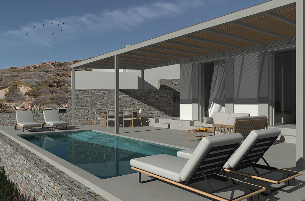 waters of Kastelas beach with an open plan outdoor lounge area with an infinity pool.