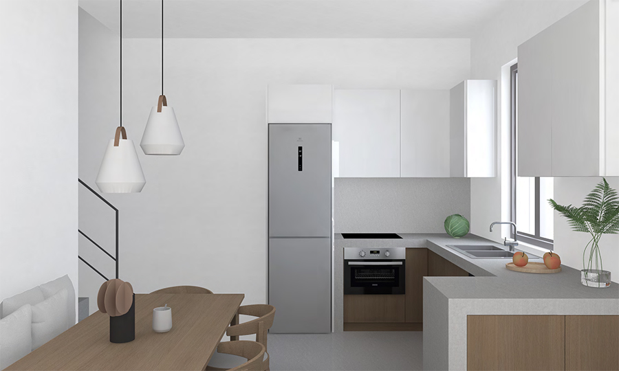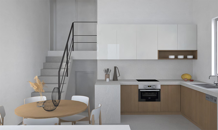 an open plan living-dining room and adjacent kitchen, while the upper levels accomodate the bedrooms