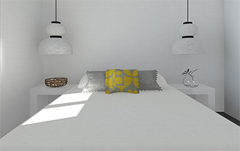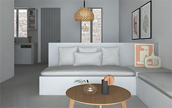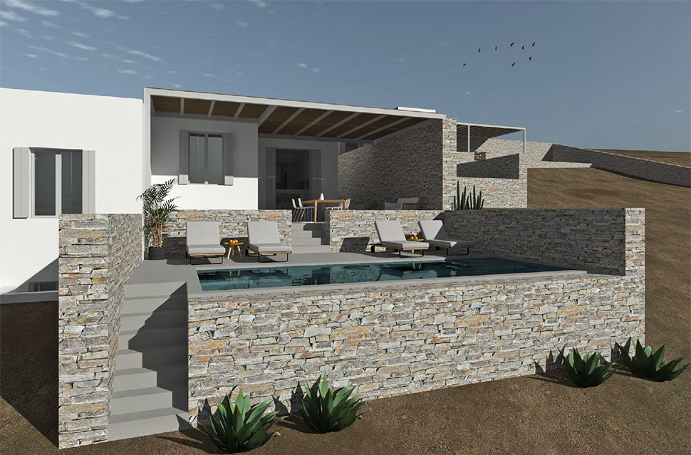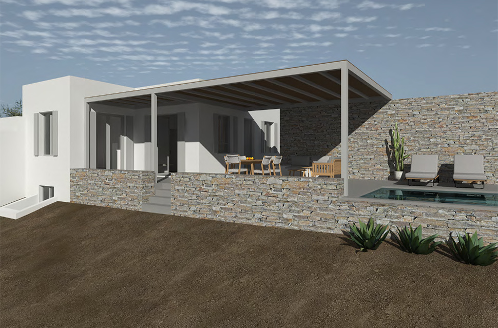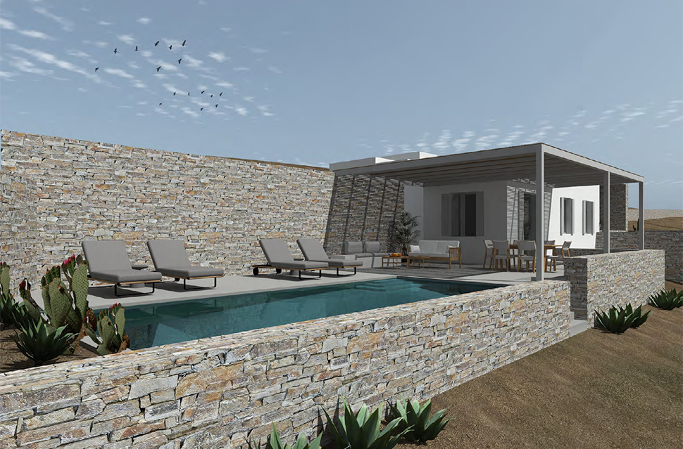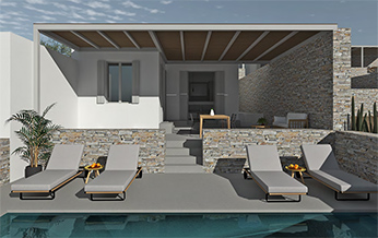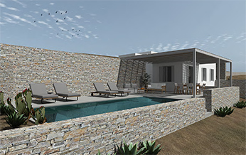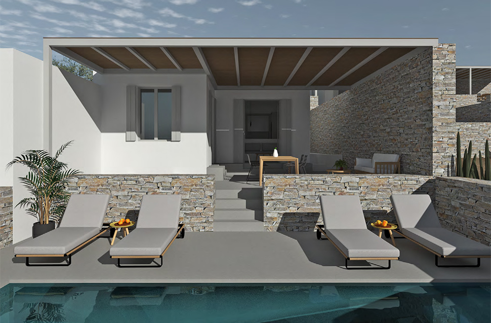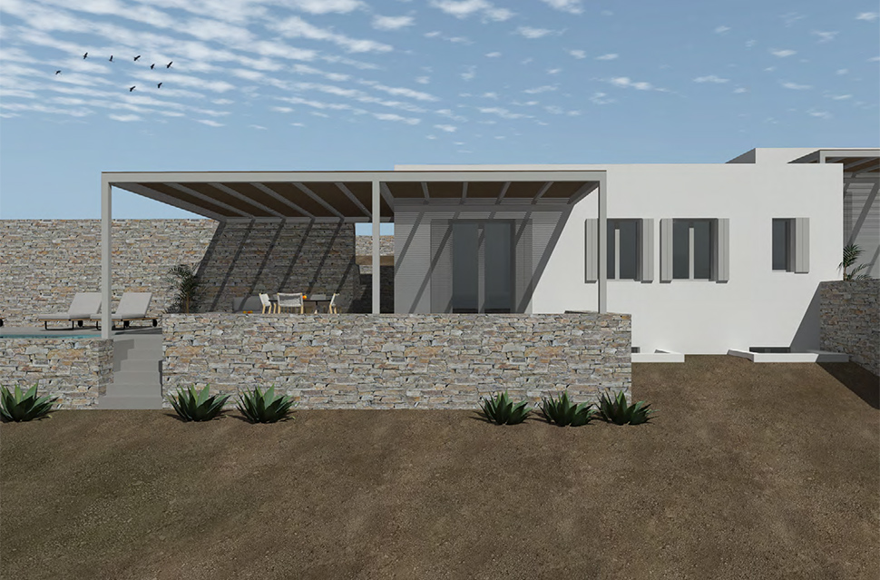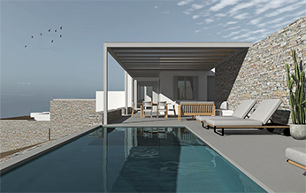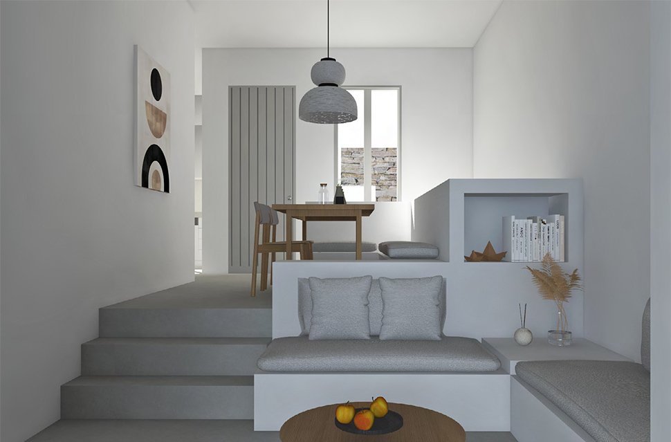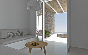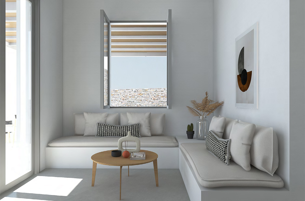 The interior design is inspired by the sophisticated simplicity of the cycladic architecture, like the builtin