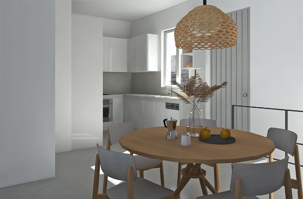 on different levels. The ground floor of each residence consists of an open plan living-dining room and